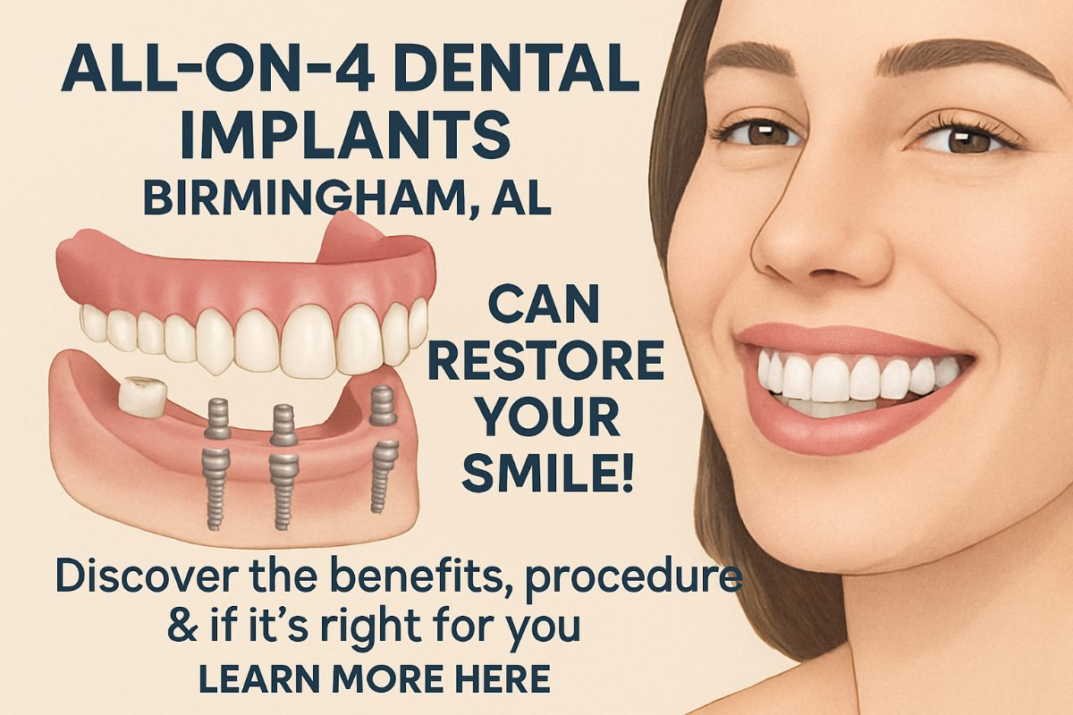 Considering full-arch replacement? This post explains all on 4 dental implants by Birmingham, AL, who they're for, the pros and cons, typical costs, and how to choose a provider. Read on if you have multiple failing or missing teeth and want clear, practical steps for whether all-on-4 is right for you.