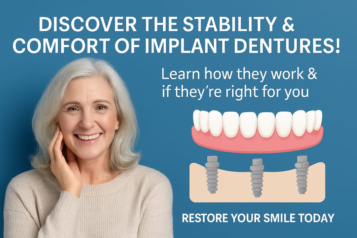 A dental implant is a titanium post placed in the jaw and topped with a crown; it’s the closest match to a natural tooth in feel and function, though it usually takes longer to finish and costs more. For people missing multiple teeth, implant dentures (full or partial arches anchored to implants) offer much greater stability than removable dentures.