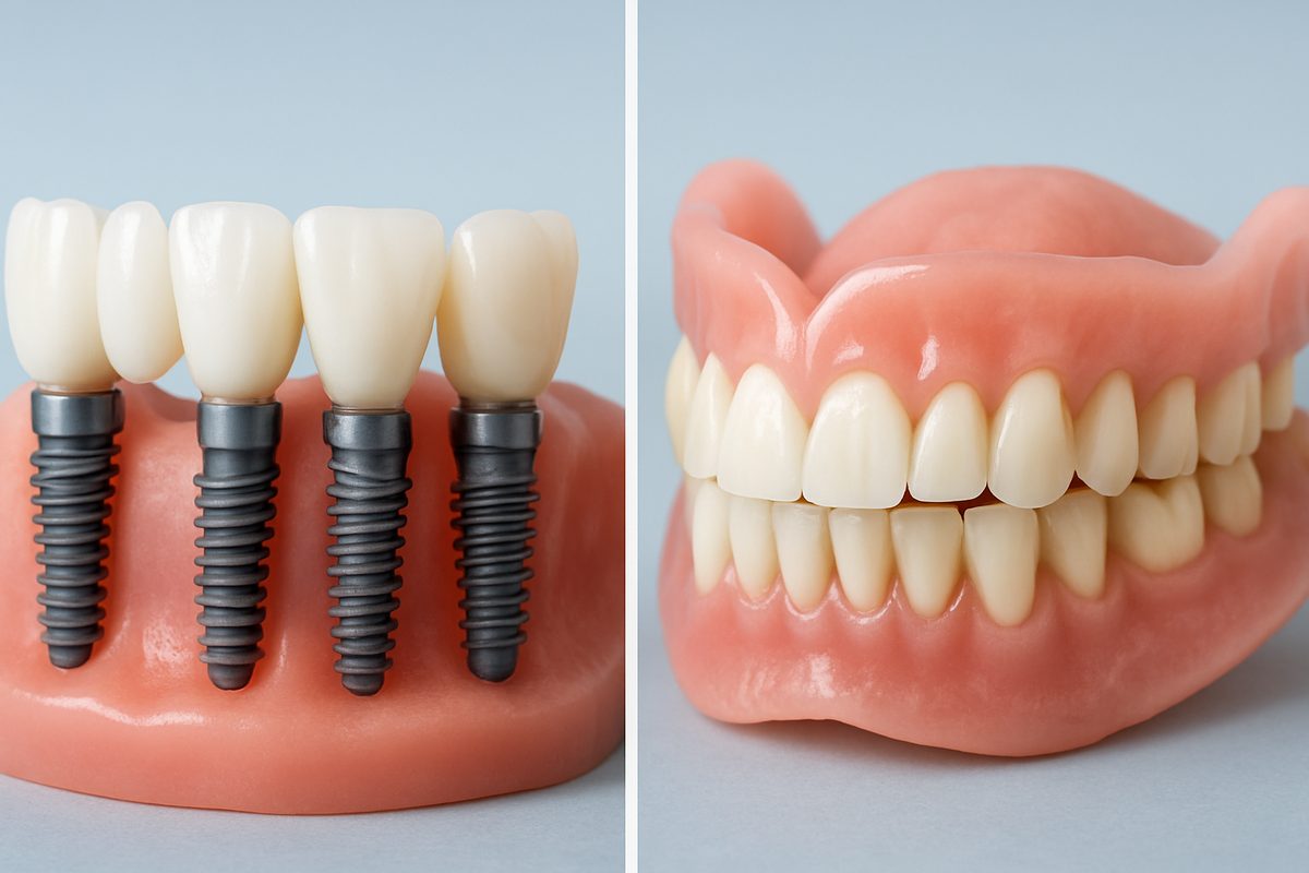 - Maintenance — Implants are cared for like natural teeth; dentures need daily removal and cleaning.