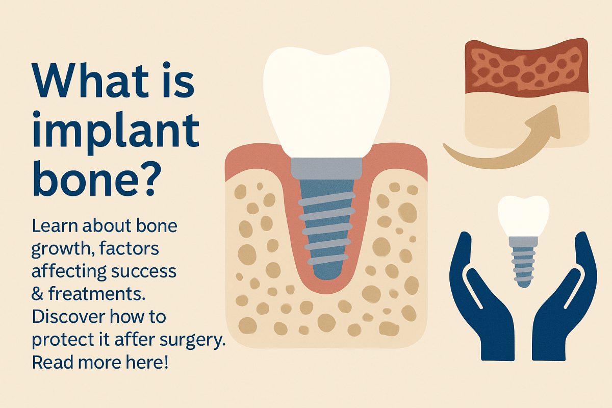 Implant bone refers to the jawbone that must fuse tightly to a titanium or ceramic implant. Osseointegration is the process where bone cells attach directly to the implant surface. Good bone quality (density) and quantity (volume) give the implant stability and reduce the chance of loosening or failure over time.