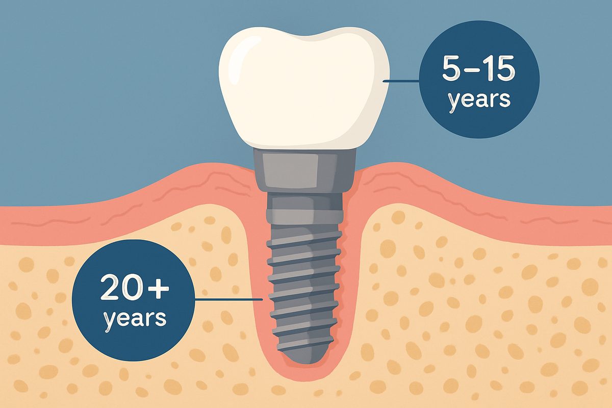 - Implant fixture: 15–30+ years, sometimes a lifetime with proper care