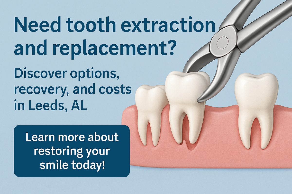 Tooth extraction is the removal of a damaged or problem tooth. Many people face decisions about tooth replacement after extraction to keep chewing, speaking, and smiling normally. This article explains common reasons for a tooth extraction, what to expect during the procedure, short- and long-term tooth replacement options, and how to choose the right path for you in Leeds, Alabama.
